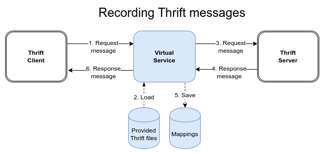 As you can see in the diagram below, the virtual service acts as a proxy between the Thrift client and Thrift server. The provided Thrift files are used to determine the message schema of the request and response messages for the requested Thrift method. Mappings are saved representing request/response pairs that have been recorded.