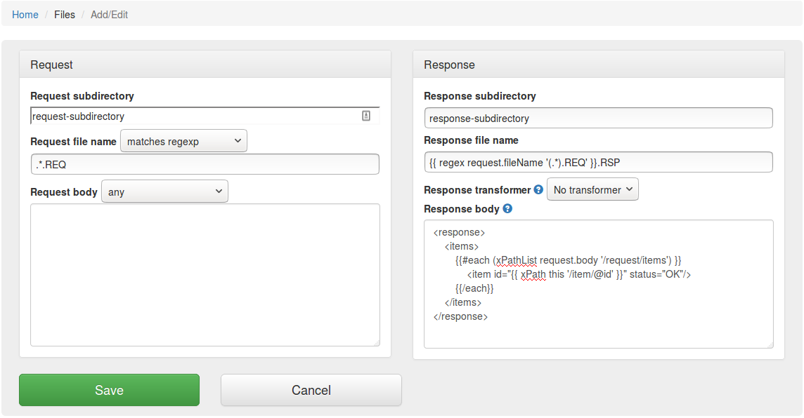 | equal to XML | equalToXml | Check that the received request file contents is XML and that it is equal to the request body XML specified in the mapping |
